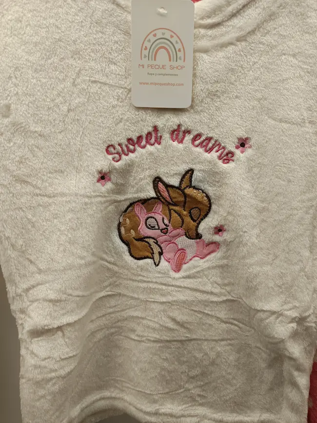 Pijama calentito de coralina, a juego con el de mama, va por talla, hay que coger una talla mas, ya que al ser gordito da menos. Mi hija tiene 6 años y se pone la 8